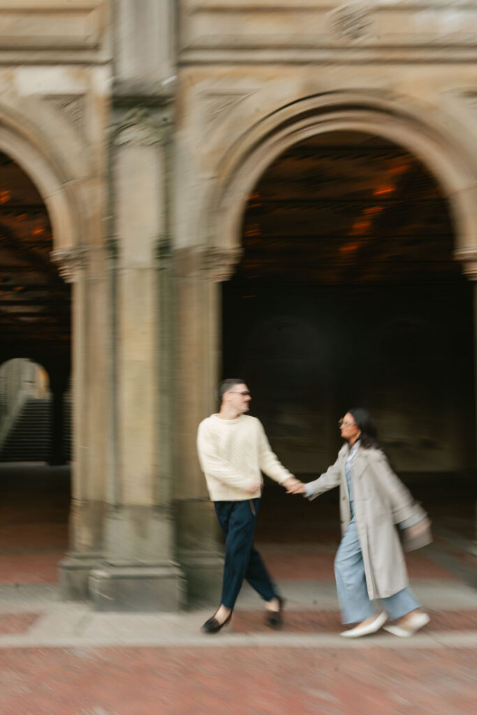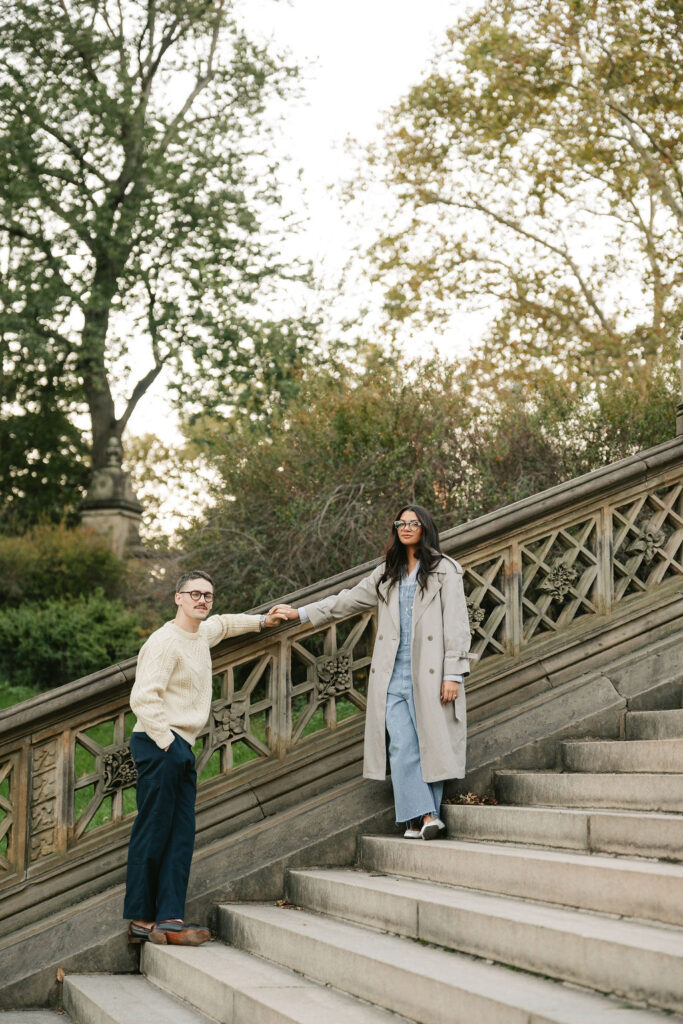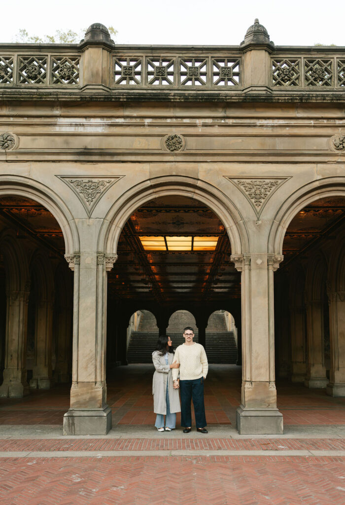 Once the sun started peeking through the trees, we began to move through the park. Timothy and Noelle were total naturals. We started at the center circle near Bethesda Terrace. From there, we wandered along the lakeside paths. The leaves were in full fall mode. Then came the staircases and arches around Bethesda Terrace. That architecture never misses.