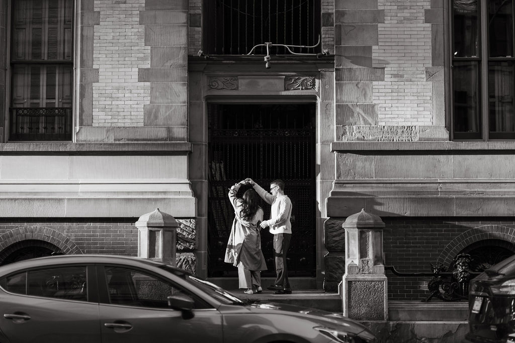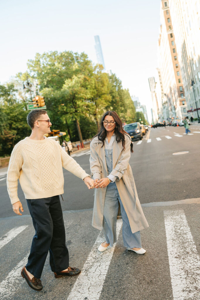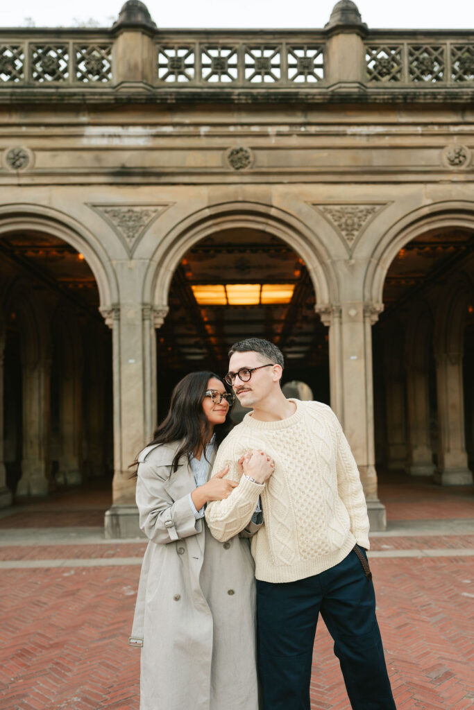 When people think about Central Park engagement photos, they probably imagine golden light, fall leaves, and couples twirling under the Bethesda arches. And yeah, that’s part of it. But for me, it started way before that, like way before sunrise. I was staying near Wall Street, which is kind of wild when you consider how chaotic that area usually is. But stepping out of my hotel that morning was nearly silent. The bull was empty. No one was there. I literally stood there for a second like, “Okay, this is weirdly peaceful… am I in the right city?”